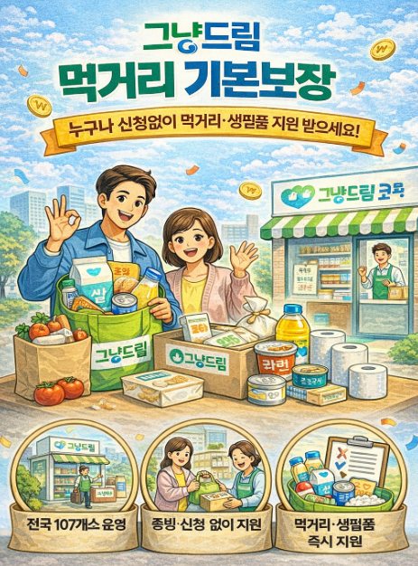 그냥 드림은 소득, 재산, 신분 등에 관계없이 별도의 신청이나 증빙 절차 없이 바로 식비와 생필품을 받을 수 있는 제도로, 기존 복지제도의 사각지대를 보완한 새로운 유형의 공공지원 모델로 주목받고 있습니다. 운영 두 달 만에 3만 6천 명 이상의 이용자를 기록하며 위기에 처한 국민에게 실질적으로 도움이 될 '마지막 사회안전망'으로 자리매김했습니다.